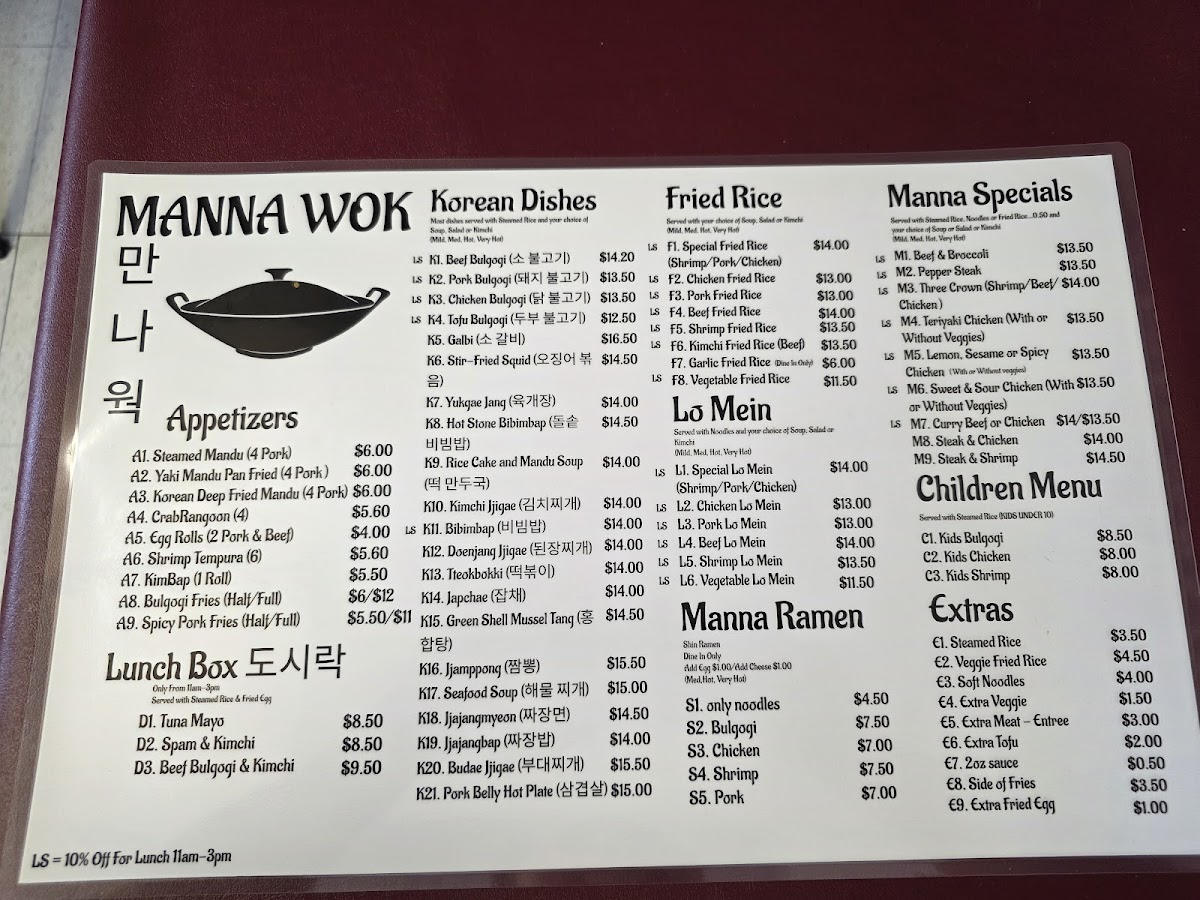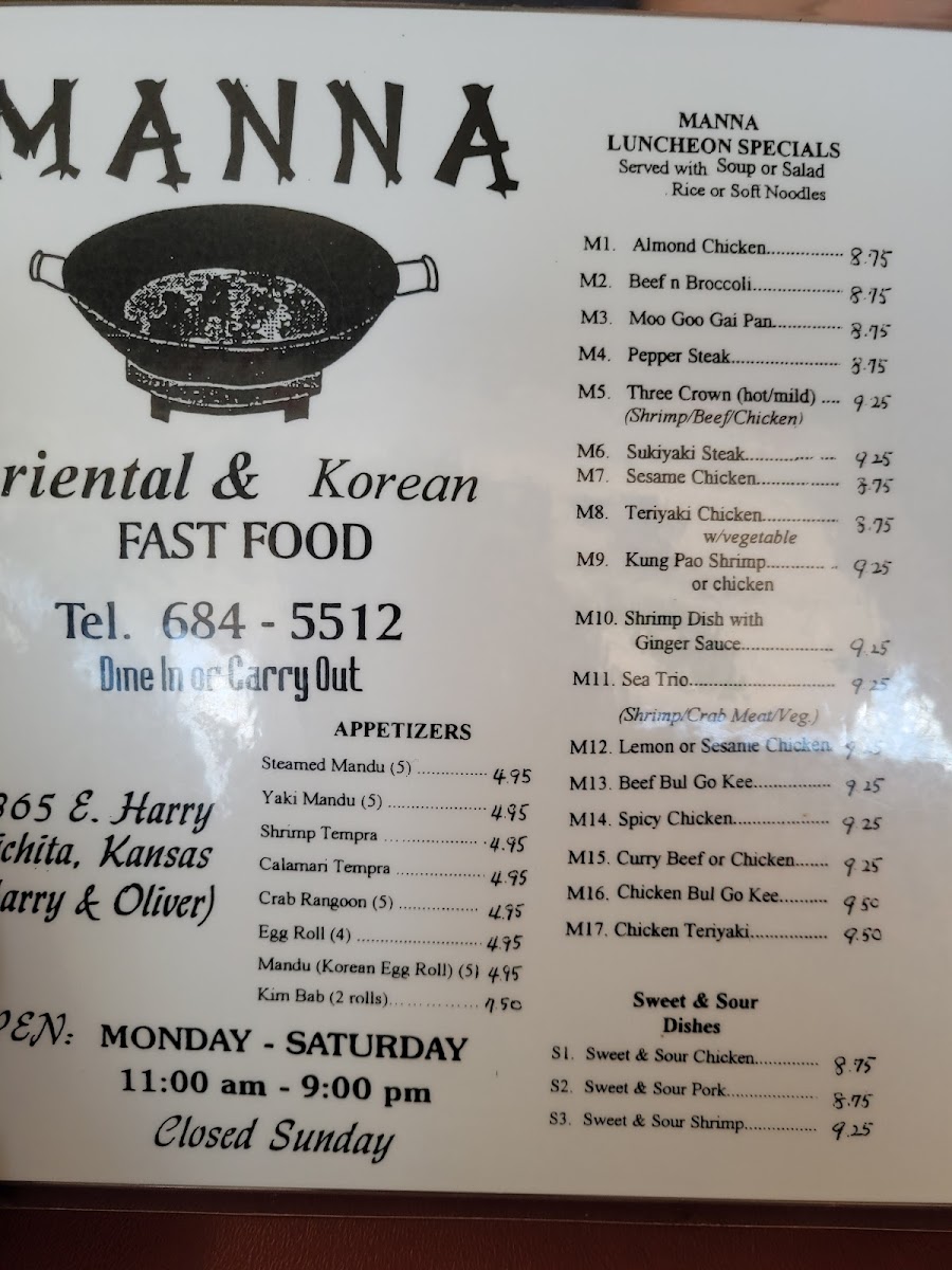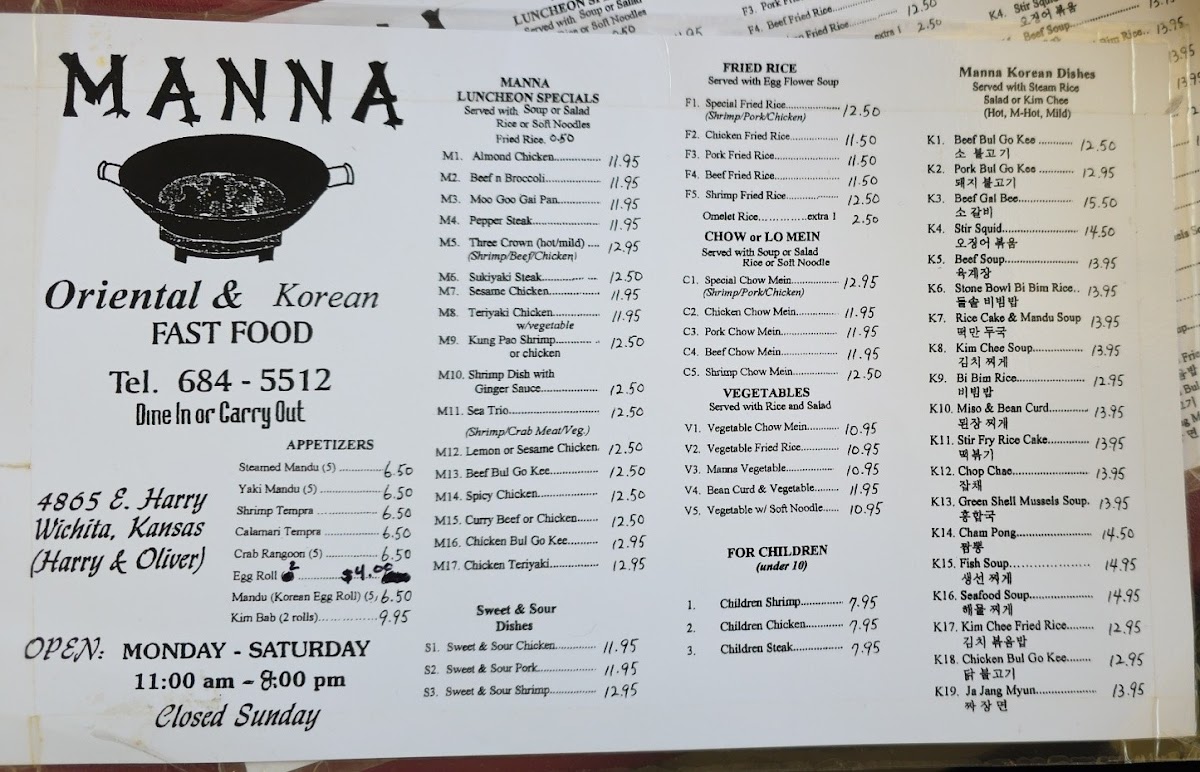 Welcome to Manna Wok Oriental Restaurant, a beloved gem located at 4865 E Harry St, Wichita, KS. This quaint eatery has been delighting locals since 1992, known for its authentic Korean dishes and cozy atmosphere that feels like a warm embrace from your Korean halmeoni.
